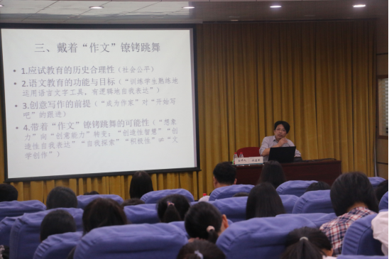 许老师从事创意写作教学与研究多年,对创意写作的理论与实践有较为深入全面的把握,同时,他也曾参加过高考作文命题与阅卷工作,熟悉中学作文教学的特点与困境所在。讲座一开始,他从写作和作文的区别导入,给我们展示了创意写作与中学作文教学的必然联系,他认为,在新课标要求下,中学作文教学改革要取得实效不能不重视创意。创意写作在思维创新和写作技巧训练方面的优势,可以帮助中学作文教学带着镣铐跳出轻盈的舞蹈来。
