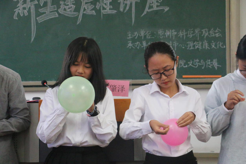 许肇泽老师在讲授人际关系时邀请学生上台参与扎气球活动。他指出:气球漏气的过程就是化解矛盾的过程,我们要学会处理好自己的人际关系,让大学生活更加美好。他强调:喜欢别人,又能让别人喜欢,才是世界上最成功的人。他建议大学生应树立自主、质疑、终身、广泛的学习理念,运用归因及心理暗示措施转变看法,巧用“点赞技术”,塑造积极心态。