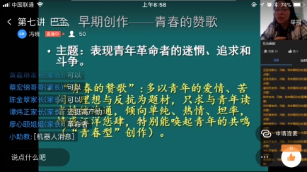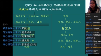 45分钟的网络教学时间,冯晓老师以问题引导的方式带领学生完成了对巴金长篇小说《家》的主题内涵的解读,展示了其在讲授经典作家作品时富有个性化的教学方案。