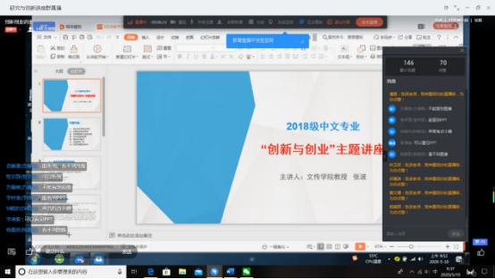 5月10日上午9点30分,文学与传媒学院张波教授应邀为18级汉语言文学专业的同学们作了题为《创新与创业》的主题讲座。18级汉语言文学专业全体同学160余人通过钉钉直播的形式参与了此次活动。