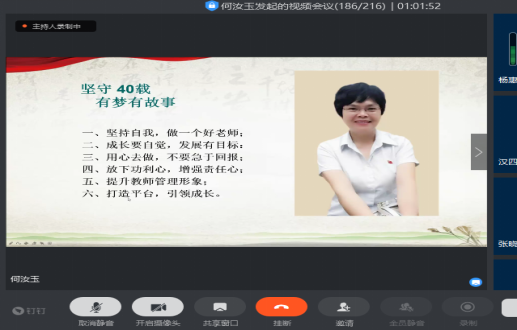 何校长把自己40年来的教育智慧像讲故事一样娓娓道来,她认为:要做好一名优秀的班主任,成长比成功更重要,成长要自觉,发展要有目标。一个教师的成长优秀与否,取决于他能否坚持自我做一个好老师的信念。她提醒同学们记住:学校是个人成长的园地,是个人生存的依靠,是提升自我价值的熔炉,要用好学校这个大平台。