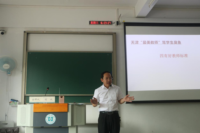 讲座伊始,胡斌老师以“天津最美教师骂学生臭鱼”这一反面案例相关视频切入,引出习近平总书记勉励大学生做党和人民满意的“四有”好老师的相关理论,引发同学们的思考,并让同学们初步了解“四有”好老师的标准。