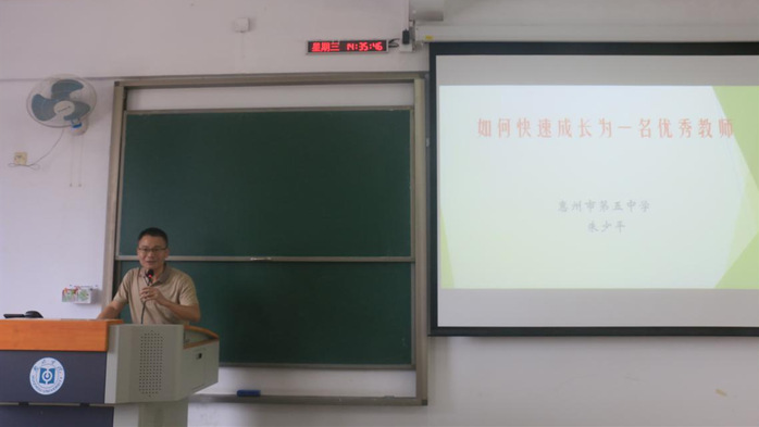 朱老师是文传学院97届的优秀校友,从自身在惠州学院的学习经历导入,并从教学年龄的角度出发,阐明成长为一名优秀教师的不易。朱老师从热爱、比勤、得法、善学、多思五个方面展开,强调成为一名优秀教师的基本条件是热爱,即热爱教育、热爱学生,阐明热爱是从事教师职业的重中之重。同时朱老师以上海市著名的语文特级教师于漪老师的“三次备课”为例,提出作为教师与其他老师比勤是必不可少的,表示教师不应害怕上公开课,要从别人评课的建议中不断改进自己的教学方法,拓宽自己的知识面,给学生树立学习榜样。而教无定法,贵在得法,朱老师从管理、教育、教学三方面提出得法的具体要求,强调了不同学生之间的区别,应根据学生的特性改变备课方式和教学方法。善学与多思亦是新形势下教师寻求自身不断发展的重要途径和方法,唯有虚心向学,不断反思,才能成长为优秀的教师。