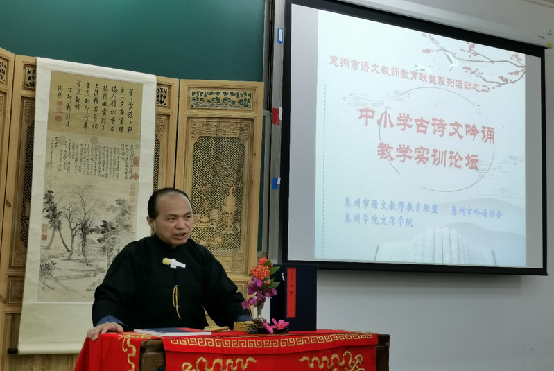 2021年5月1日上午8点,由惠州市语文教师教育联盟、惠州市吟诵协会、惠州学院文传学院三方联合举办的“中小学古诗文吟诵教学实训论坛”在惠州学院旭日楼101课室正式拉开帷幕。参与此次活动的人员有中国民俗学会北京分会常务理事张卫东先生,惠州市吟诵协会会长胡谭珠以及协会成员,惠州学院文学与传媒学院骨干教师,惠州市中小学语文教师及吟诵爱好者,惠州学院文传学院第七届、第八届卓越语文教师实验班学员。