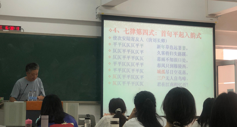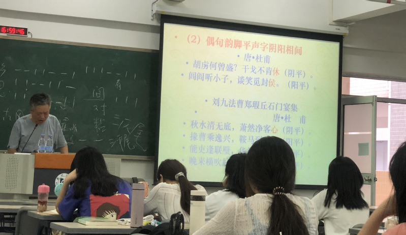 杨子怡教授讲课幽默风趣,绘声绘色。尤其在讲解诗歌的平仄韵律时,杨教授感情饱满,声情并茂,极具感染力。课后,同学们纷纷表示杨教授的教学具有很强的指导性,能有效地将大家带入诗歌情境当中,激发了同学们赏诗和写诗的兴趣