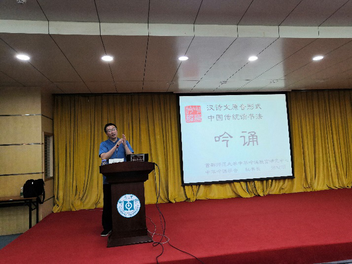 讲座开始,徐键顺老师寄语在场师生,在当下和平生活中,文化发展更需要依靠青年的力量,青年青春活力的注入会使这个时代创造出新的文化思潮。紧接着,徐老师通过《太白心音图》《春园吟诗图》和《观瀑吟诗图》介绍吟诵悠久的历史,并结合叶嘉莹先生读杜甫诗《赠卫八处士》的视频介绍中文的“读”是有声调有感情的读书方法。他指出,吟诵是中国古代教育体系的基石,也是基本的学习方法和教学方法。中国的诗歌朗读是讲求技巧和感情的,每个字都会有不同的音调和语气,吟诵对于学习诗歌具有至关重要的作用。徐老师以《诗经》为例指导在场师生如何正确掌握吟诵的方法,在他的耐心点拨下,在场师生很快就体验了吟诵的技巧,现场传来热烈的欢笑声。
