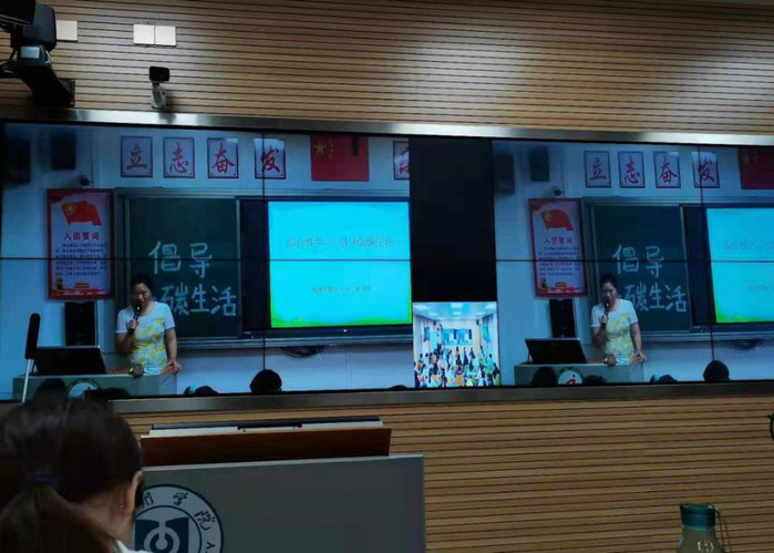 顾同学积极与同学们进行互动提问,力求同学们“了解低碳生活,做低碳达人”。为活跃课堂,丰富分享形式,顾同学与同伴用相声的形式生动演绎低碳生活,让同学们对低碳生活的含义、低碳生活的做法、低碳消费的优点等等有了更多更深层的理解。在分享的最后,顾同学和台下的同学一起念读低碳宣言,希望大家一同携手“节能减排,筑梦未来”。