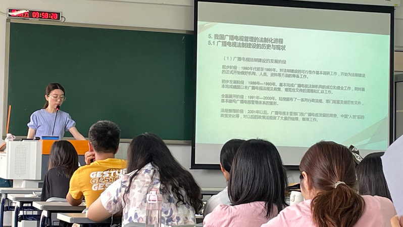 杨卉旬老师首先为同学介绍了广播电视在社会框架中的行政管理手段,通过相关的新闻案例及资料从四个方面总结了我国广播电视管理体系的特点。随后,杨卉旬老师对我国广播电视管理的政策、法规体系作了全面的梳理和总结,介绍了我国广播电视法规的基本原则和主要内容,强调了相关政策法规对我国广播电视管理的重要意义。其中,杨卉旬老师着重讲解了《广播电视管理条例》的主要内容,并让学生通过对具体案例的具体分析,总结出其特点和影响意义。整个授课过程讲述清晰,逻辑严谨。