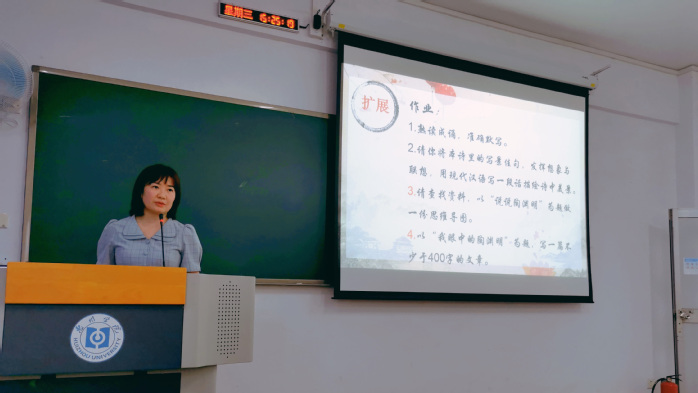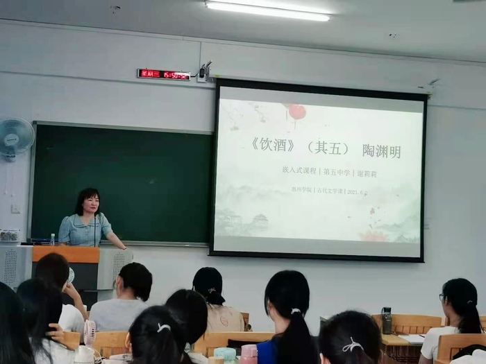 2021年6月2日下午,受惠州学院文学与传媒学院的邀请,惠州市第五中学谢莉莉老师(初中语文高级教师、惠州市优秀教师)在惠州学院旭日大楼403室,围绕“初中语文古诗教学”,为2019级汉语言文学专业6班的同学开展嵌入式课堂教学活动。