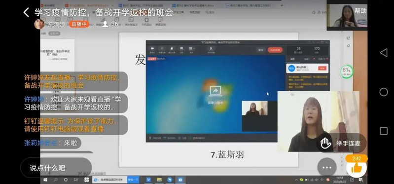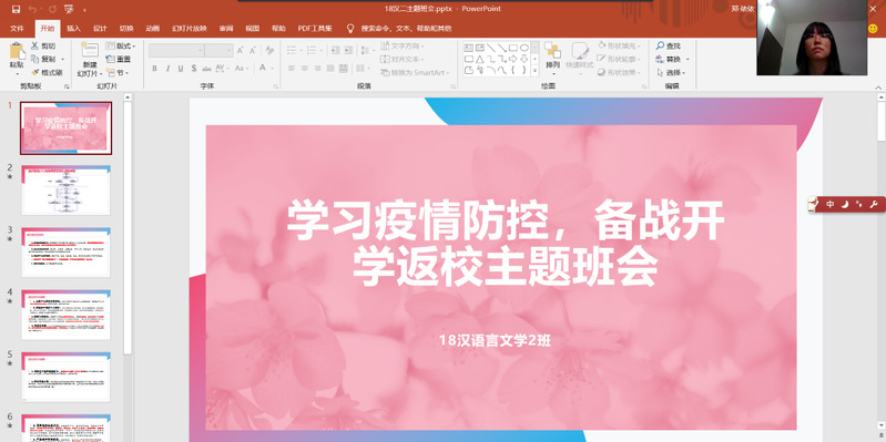 此次召开了一个“学习疫情防控,备战开学返校”的线上班会。主持人给我们讲了很多疫情防控注意事项,还有返校要了解的一些事情,这些虽然在不同的地方和时间说过很多遍了,但是真的很重要。很多细节问题也值得我们注意,比如佩戴口罩和摘取口罩要按照正确的方法来,不然口罩就只是个装饰作用,而起不到防护作用。