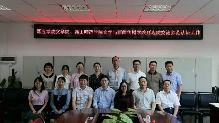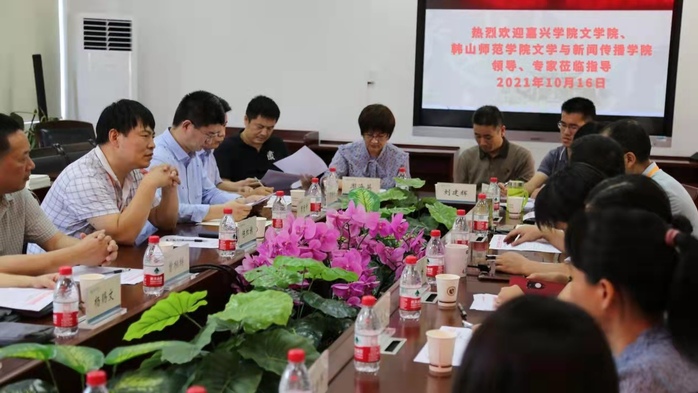 为更好地推动汉语言文学师范专业认证工作以及加强党建工作,2021年10月16日下午3点,高校文学院工作建设座谈会于旭日楼1-422会议室举行。会议第一阶段由我院党总支书记赖常青、第二阶段由我院副院长申东城主持,出席本次会议的有嘉应学院文学院、韩山师范学院文学与新闻传播学院、惠州学院文学与传媒学院的领导、骨干教师代表以及辅导员等。