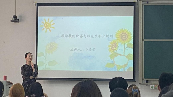 首先,卜老师重点介绍了今年省级师范生技能大赛的情况,并向所有同学介绍了大赛规则,然后提出师范生需要具备的素质和能力。首先要热爱语文教育,其次是要广泛涉猎相关理论书籍,再者是要重视普通话的练习和演讲能力的培养。