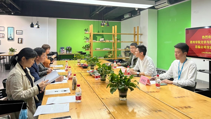 我院一行先来到位于惠州电子商务产业园区的快活电商(惠州)孵化中心。在快活电商韦泽锋总经理、校友叶峰等人的带领下,我院一行参观了公司整体环境,了解了公司的主营业务和运营状况,并一同参加了座谈交流会。会上,陈梦院长及许鑫副院长介绍了新媒体与文化创意产业学院建设的相关情况,以及本次调研的需求和目的。韦泽峰总经理对我院来访表示热烈欢迎,并详细介绍了公司的创新创业成果,就新媒体与文化创意产业学院的建设工作表示支持,并表示作为惠州学院的校友企业,非常乐意为学院的建设和发展提供助力。