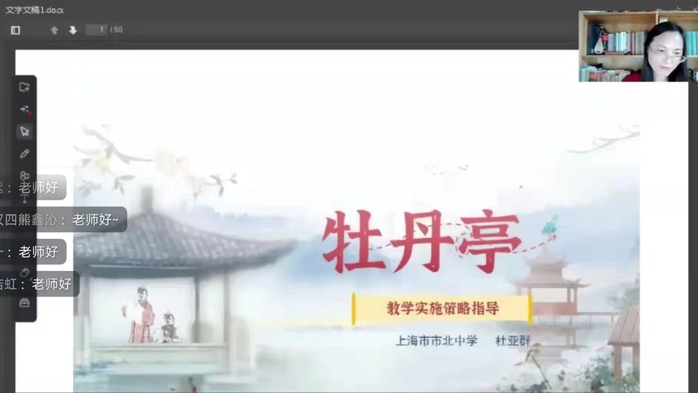 2022年6月9日晚,上海市市北中学杜亚群老师应邀为2019级汉语言文学4班、7班的全体学生开展了一堂以《牡丹亭》教学实施策略为主题的指导教学课。本次活动采取线上钉钉课堂方式进行,由任课教师申东城教授主持。2019级汉语言文学4班、7班共79位同学参与此次嵌入式课堂。