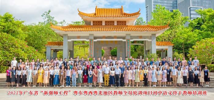 最后,陈梦院长、赖常青书记给两个培训班授予班旗。参训学员和与会专家移步到丰湖书院牌坊前合影留念。2022年广东省“新强师工程”粤东粤西粤北教师全员轮训项目——初中语文骨干教师培训班在人文底蕴深厚的惠州学院校园开启难忘而又充实的学习之旅。