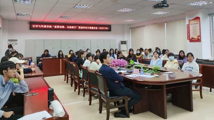 2022年11月24日中午,文学与传媒学院在旭日楼422会议室召开“感恩培养,互助前行”奖助学生代表座谈会。会议由辅导员王萍主持,文学与传媒学院党总支副书记施少翰、辅导员代表、奖助学生代表等50余人参加了座谈会。