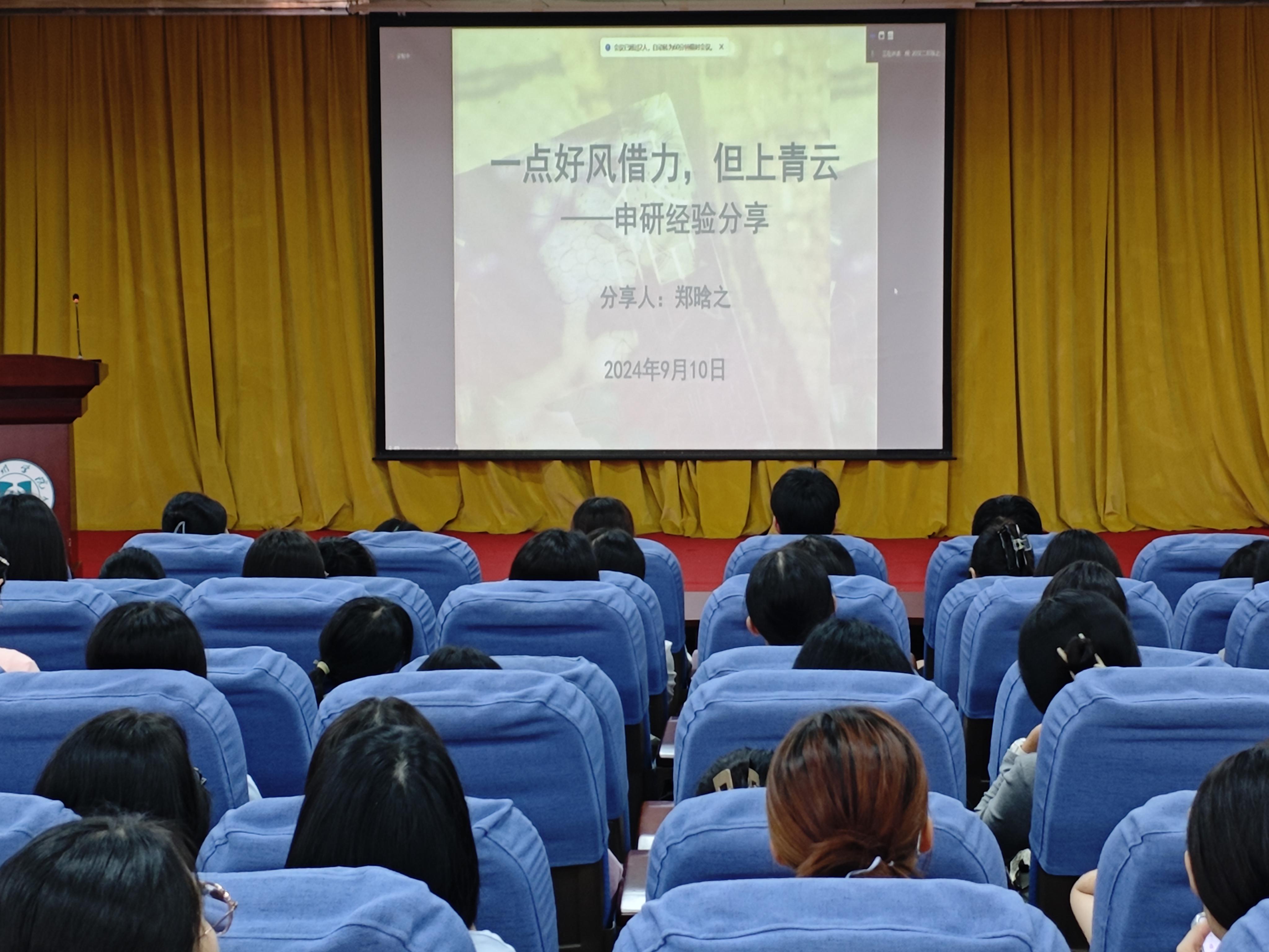 会上,梁越同学以生动形象的语言,分享了她的国内考研备考经历。她详细讲述了如何制定科学的学习计划、选择适合自己的院校专业、高效利用时间以及应对压力与挫折的方法。她强调,新生们应脚踏实地,关注身体健康,勇于尝试,感受生命的活力,并鼓励大家:“慢慢感受,慢慢探索,总能找到适合自己的道路。”