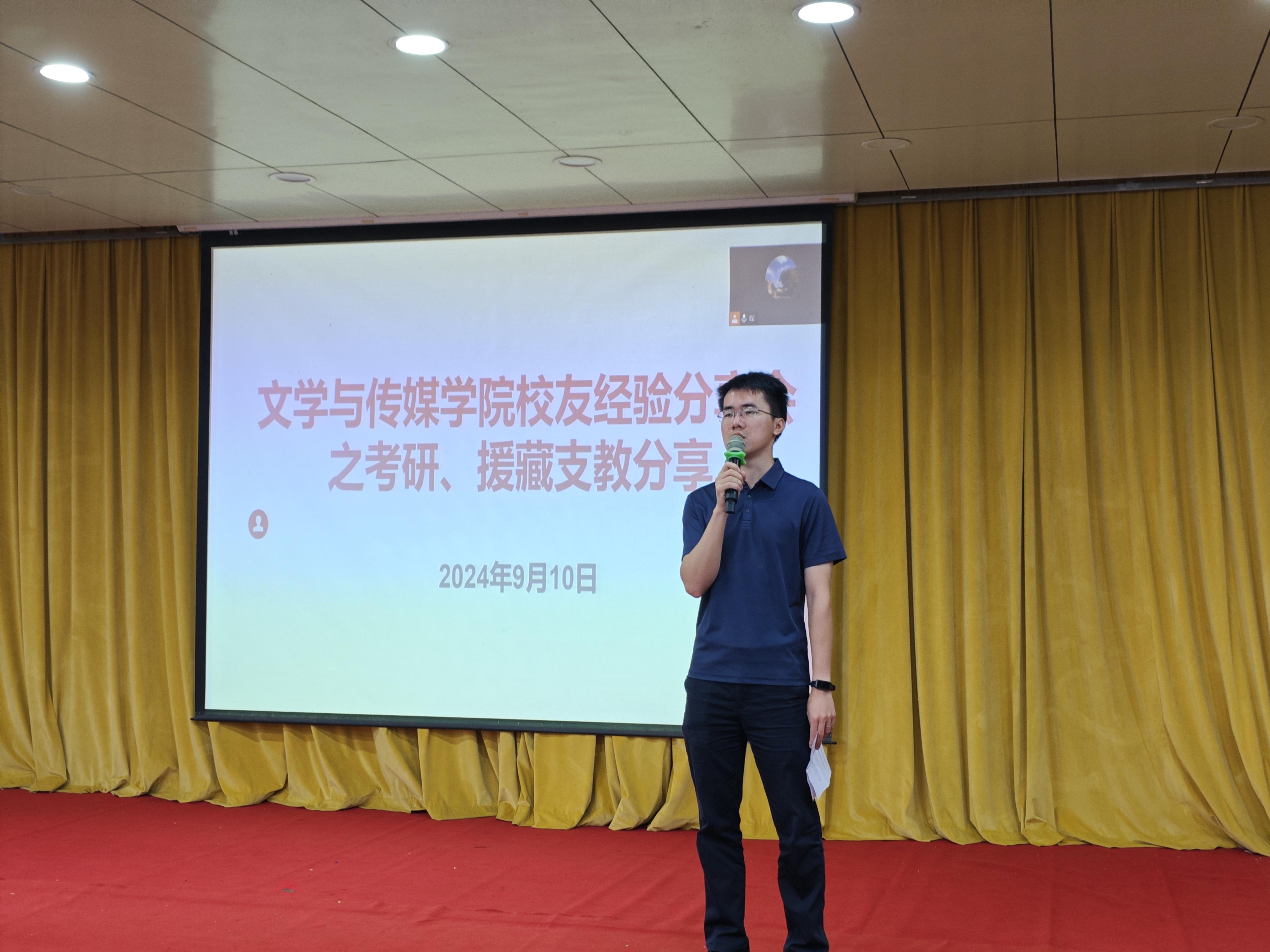 9月10日,文学与传媒学院在图书馆报告厅顺利举办了一场2024级新生入学教育之经验分享会,现场气氛热烈。本次分享会旨在借助优秀毕业生及在校学生的宝贵经验,为2024级新生提供两方面的指导,一是考研备考策略、目标设定及职业规划等的全方位指导,二是援藏支教经验的心得分享。