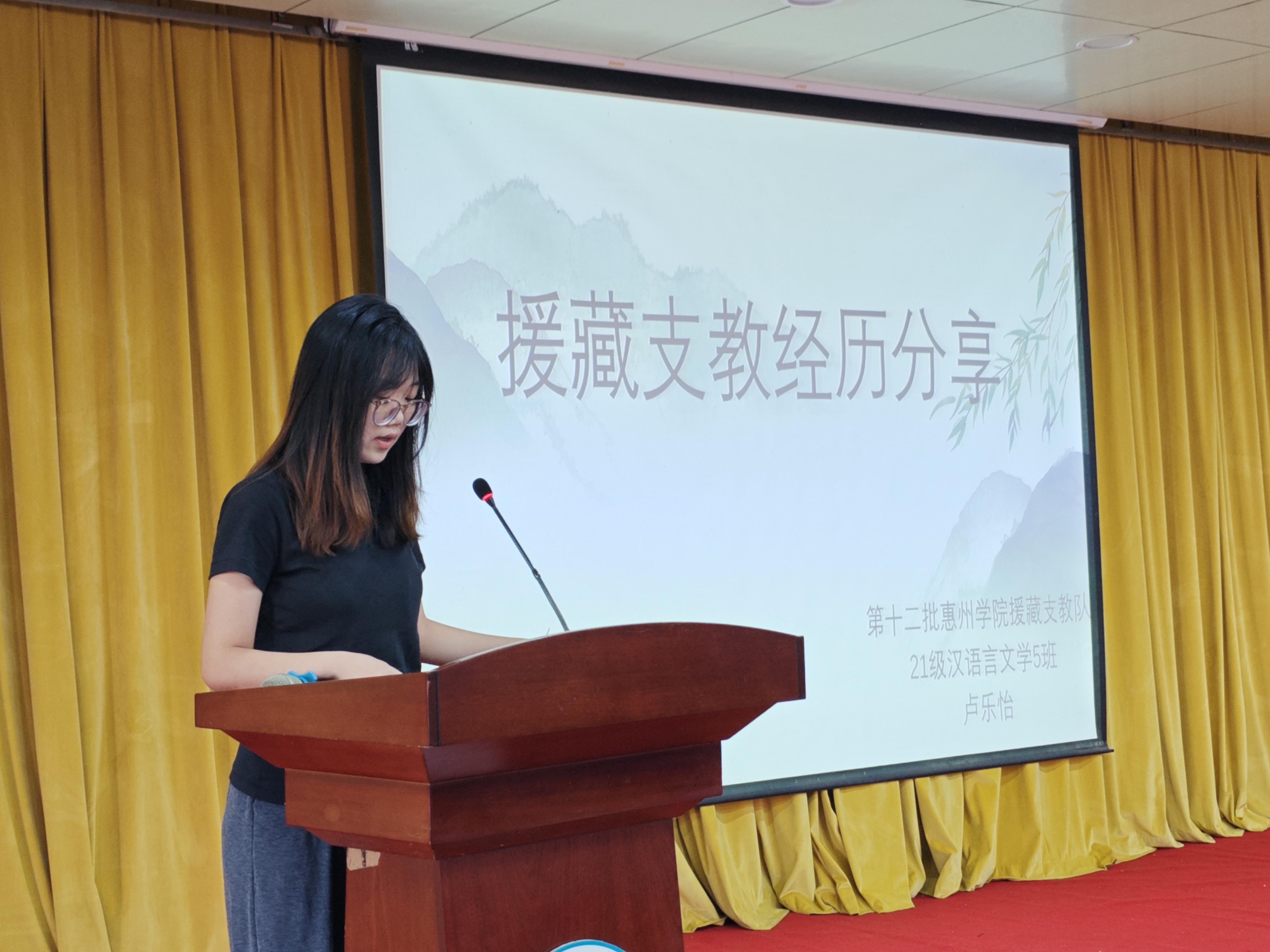 随后,刘建辉老师介绍了惠州学院第十二届援藏支教队队员、2021级汉语言专业学生卢乐怡,她为新生们分享援藏支教经验。卢乐怡同学以“双向奔赴”为主题,讲述了她与山区孩子、藏区人民、过去的自己以及广东人民与西藏同胞的四次心灵交流。她表示,这段经历是她人生中最温暖的时光,将成为她未来教学的动力。她鼓励同学们勇于拓宽视野,积极参与感兴趣的组织,勇敢尝试,勇攀高峰。