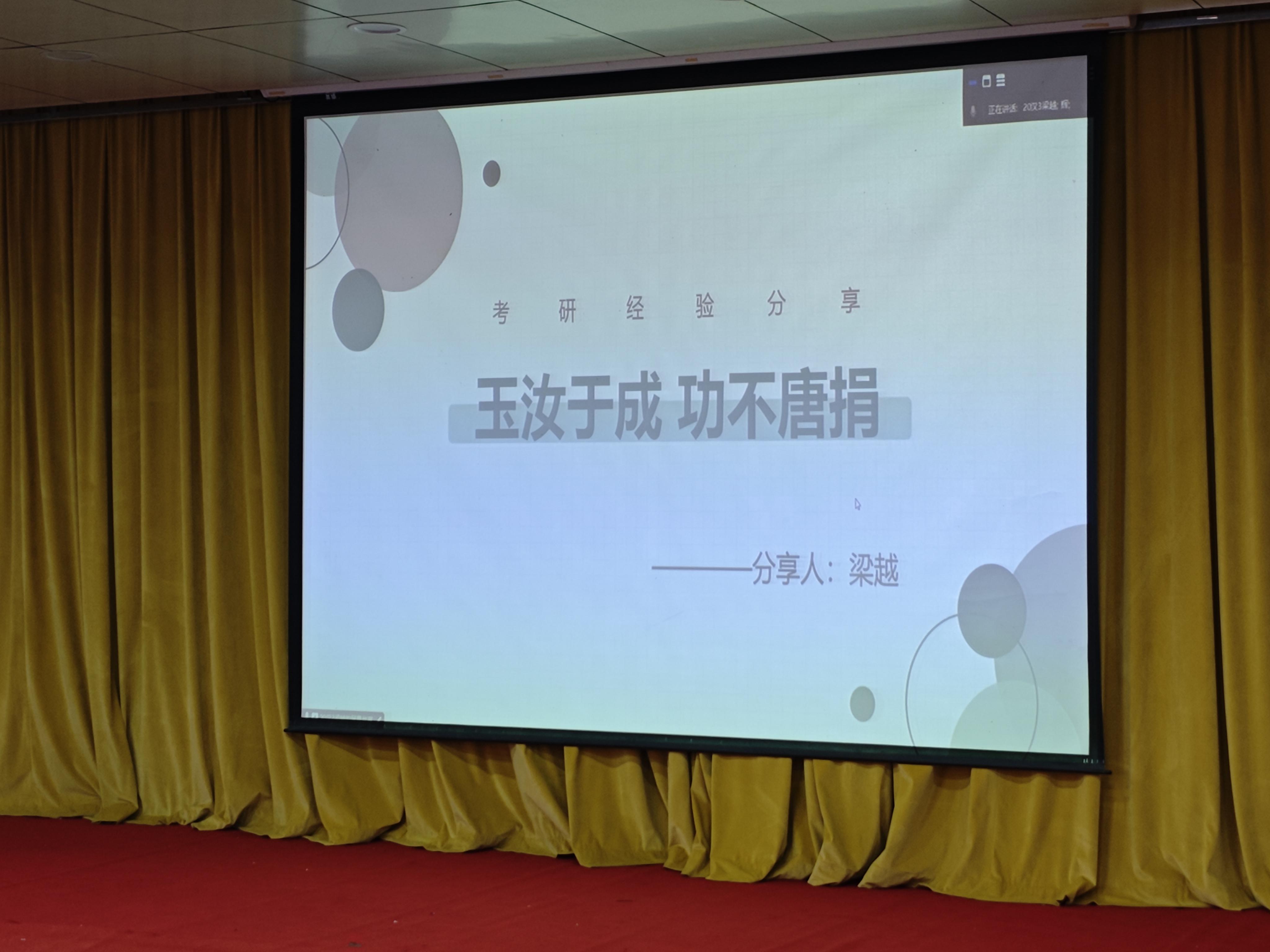 分享会伊始,2024级新生辅导员刘建辉老师介绍了两位2020级考研成功的优秀毕业生梁越、郑晗之,并宣布分享会正式开始。