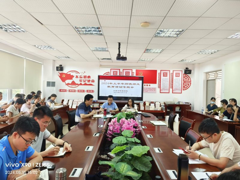 2024年5月15日下午,文学与传媒学院在旭日教学大楼422会议室召开2024年上半年师德师风教育活动专题会,全体教师开展师德师风教育集中学习,会议由党委书记马锦雄主持。