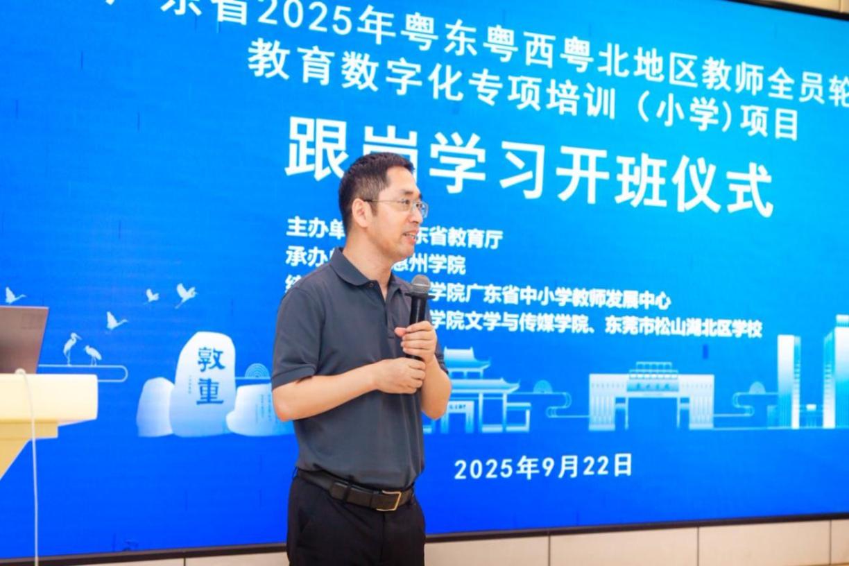 9月22日上午,广东省2025年粤东粤西粤北地区教师全员轮训-惠州学院教育数字化专项培训(小学)项目跟岗培训开班仪式在东莞市松山湖北区学校隆重举行。松山湖北区学校校长助理欧阳伟、惠州学院文学与传媒学院陈梦院长、辅导员刘建辉及全体参训学员出席仪式。
