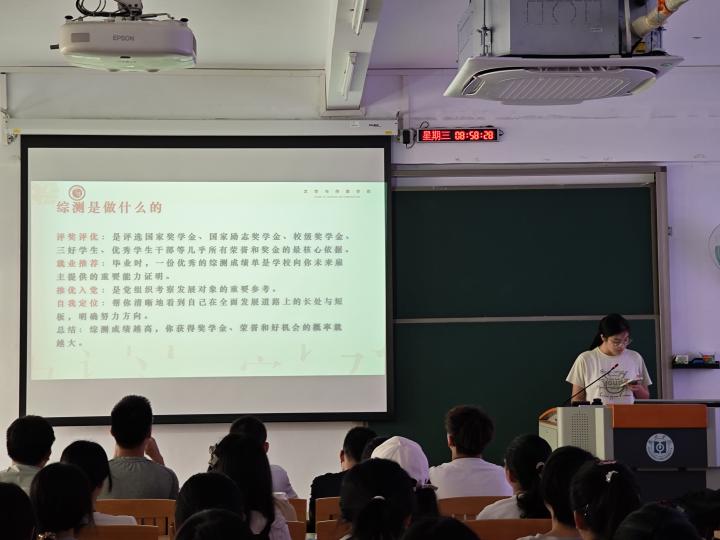 再接着,学习部的同学则把宣讲重点放在综合测评的解读上,细细拆解测评指标占比、加分项目申报要求等综测条例,鼓励大家在专注学业的同时,积极参与社会实践、志愿服务与学科竞赛,强调“综合发展”的重要性,帮助新生明确“既要抓成绩,也要强能力”的大学成长路径。
