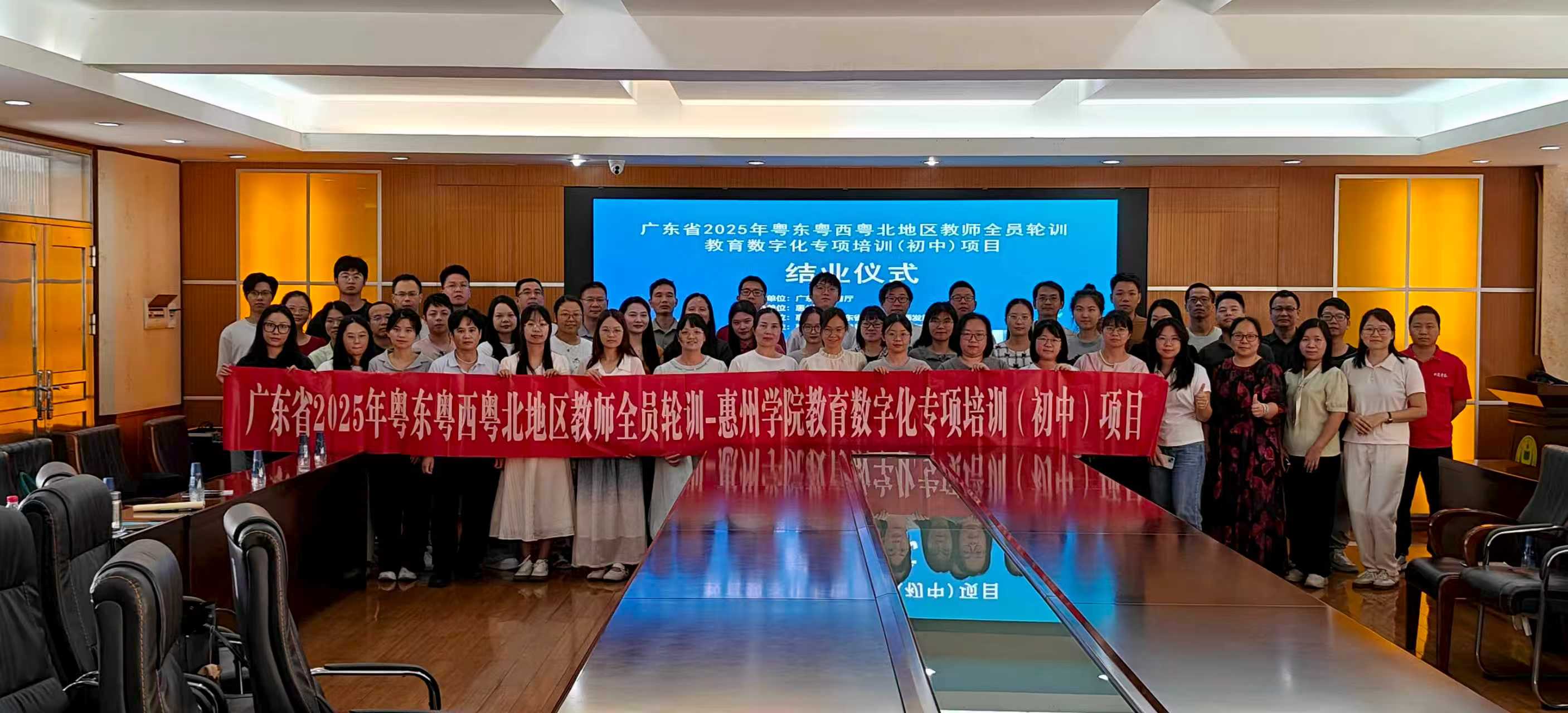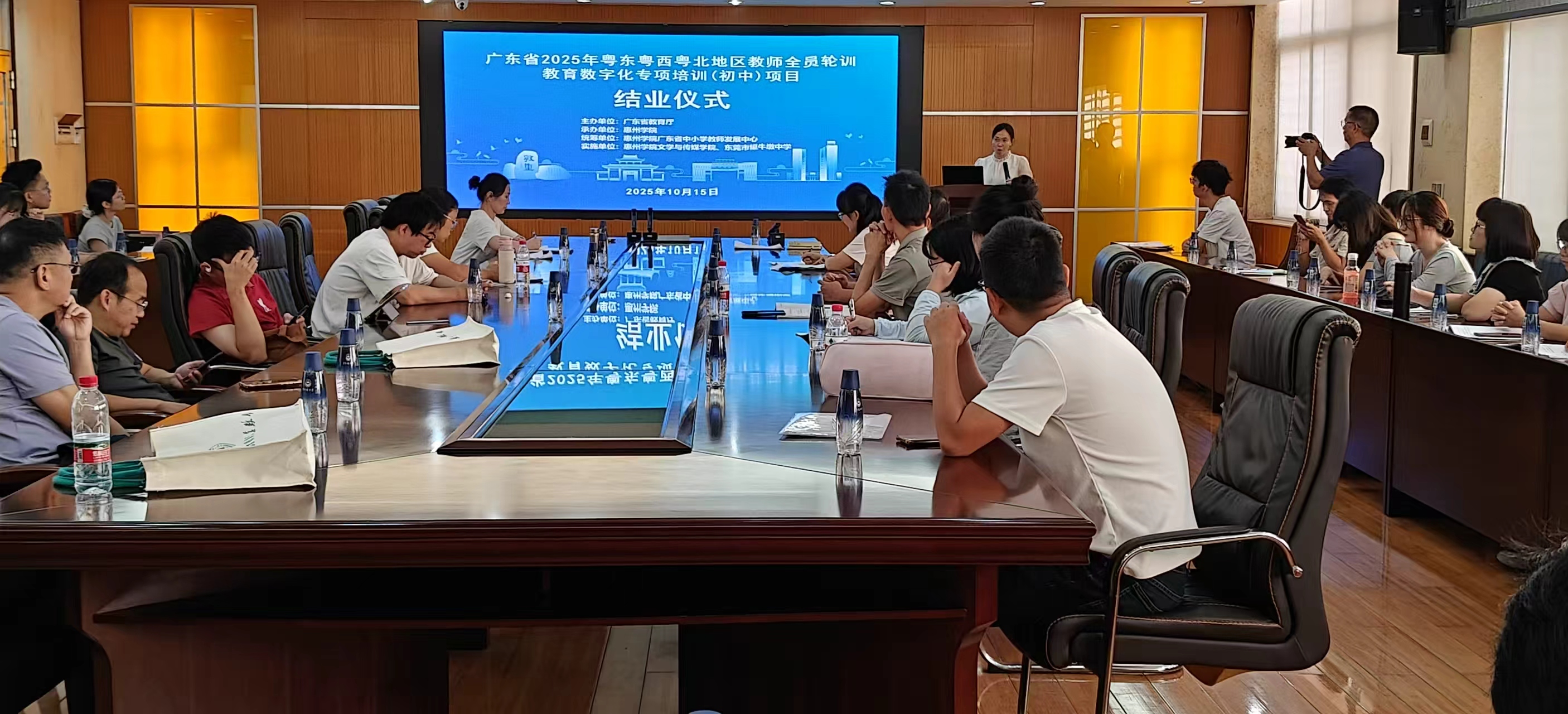 2025年10月15日,广东省2025年粤东粤西粤北地区中小学教师全员轮训——惠州学院教育数字化专项培训(初中)项目结业仪式在东莞市望牛墩中学会议室隆重举行。仪式由学习委员张雨涛主持,望牛墩中学党委书记郭冰、培训班班主任黄吉群、王萍及全体参训教师共同出席。