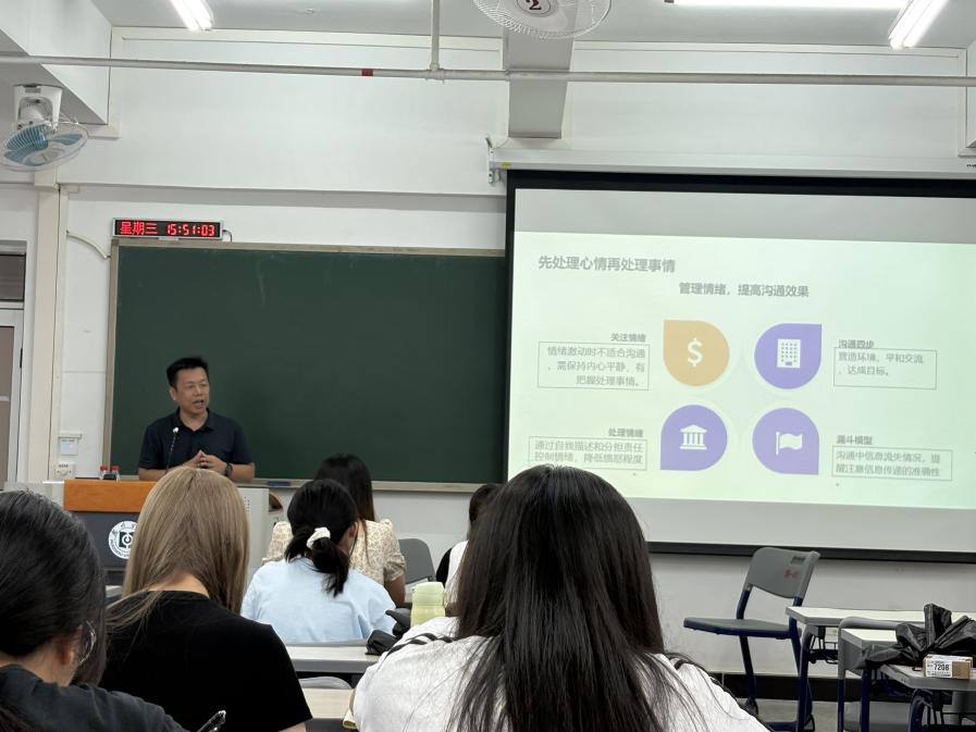 最后,林建暑老师为同学们展示了沟通漏斗模型和非暴力沟通模型,对比两者差异,强调非暴力沟通的优势,并布置了实践任务,要求参与者自拟沟通模拟情境以巩固所学沟通技巧。