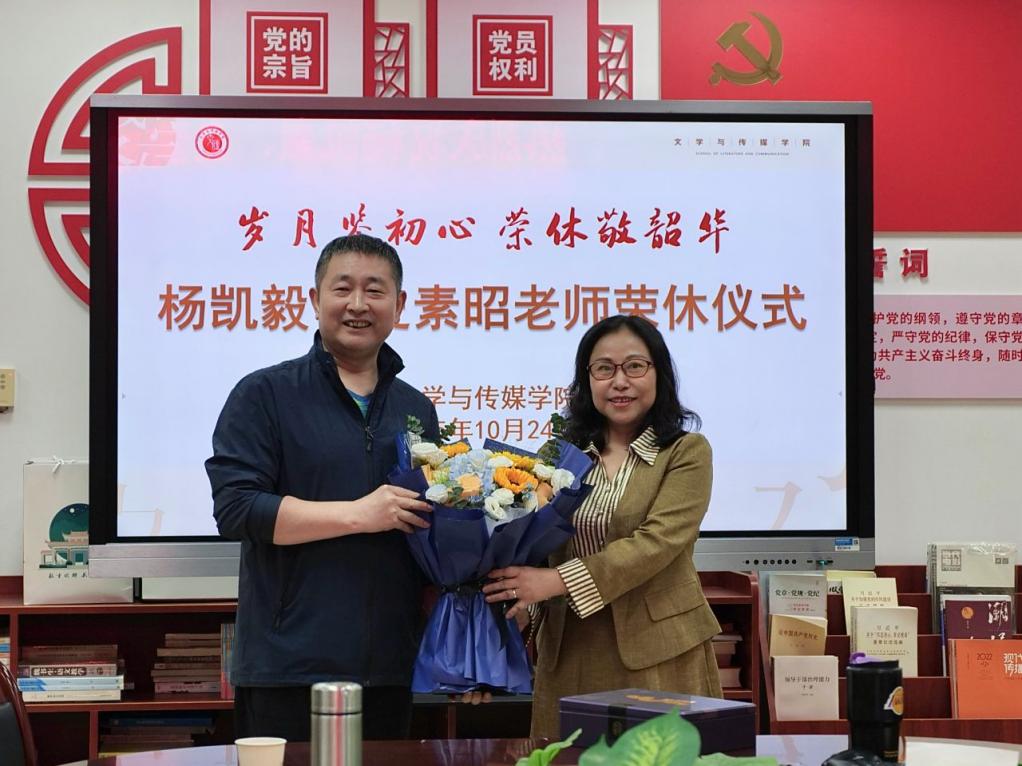 10月24日,文学与传媒学院杨凯毅、史素昭老师荣休仪式在旭日教学大楼422会议室举行。文学与传媒学院班子成员、中国古代文学课程组全体老师以及学院办公室等十余人欢聚一堂,以真挚情谊送别两位为学校教育事业发展奉献多年的“老战友”!仪式由学院党委书记马锦雄主持。