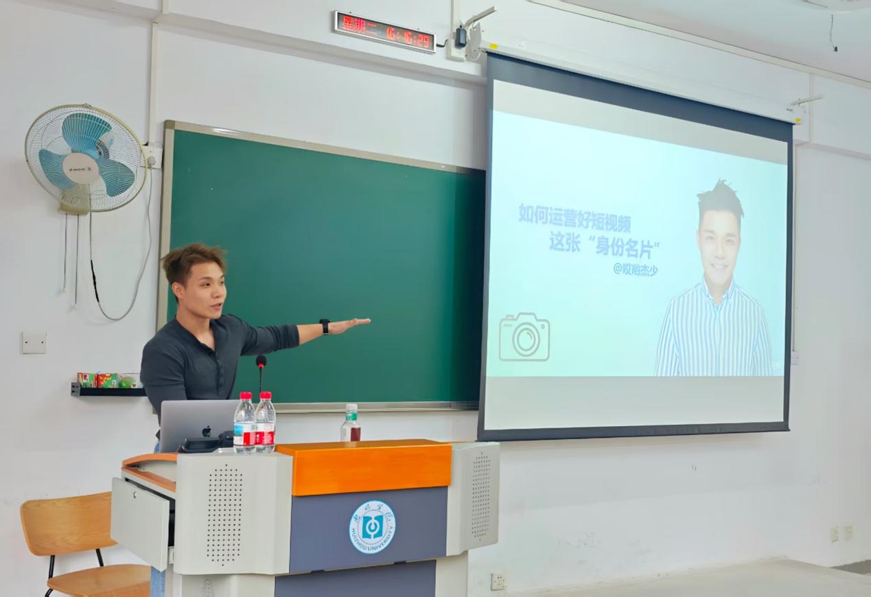 2025年10月28日下午,惠州杰艺文化公司总经理郑杰先生莅临我校,在旭日楼416课室为2024级网络与新媒体专业学生开展了《短视频创作》嵌入式课堂。他围绕“运营好短视频身份名片”这一主题,分享了短视频内容策划与制作的实战经验。