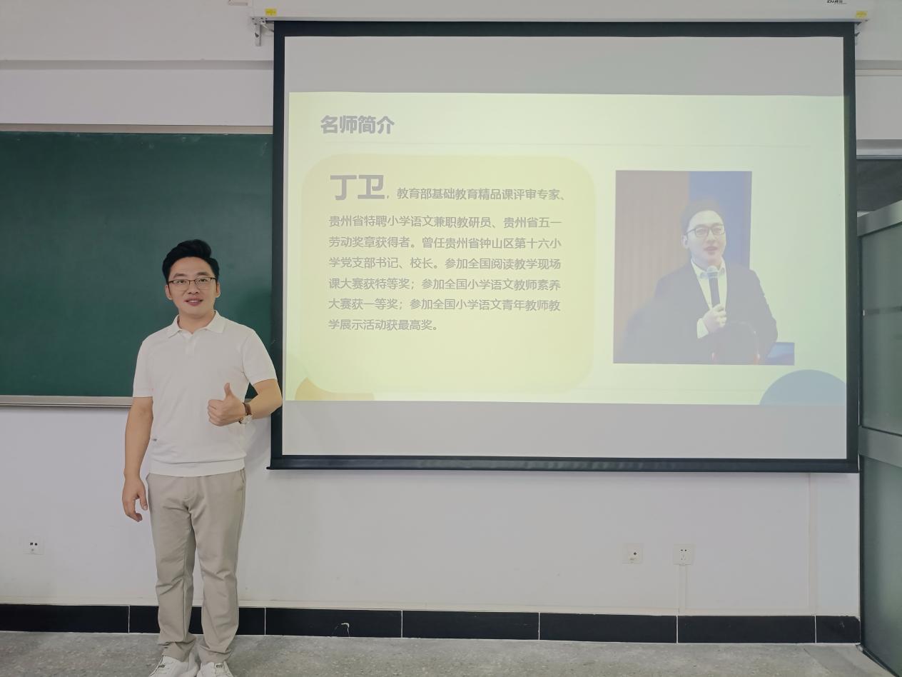 2025年10月31日下午,文学与传媒学院在旭日楼402室举行了“基础教育名师进校园”第615场活动。活动邀请东莞市南城阳光第二小学小学高级教师丁卫来我校做《语文教学的术与道》专题讲座,讲座由文学与传媒学院张继荣老师主持,学院第十二届卓越语文教师班学员、部分汉语言文学专业学生参与活动。