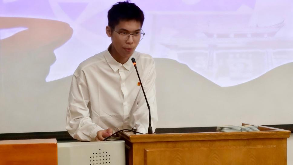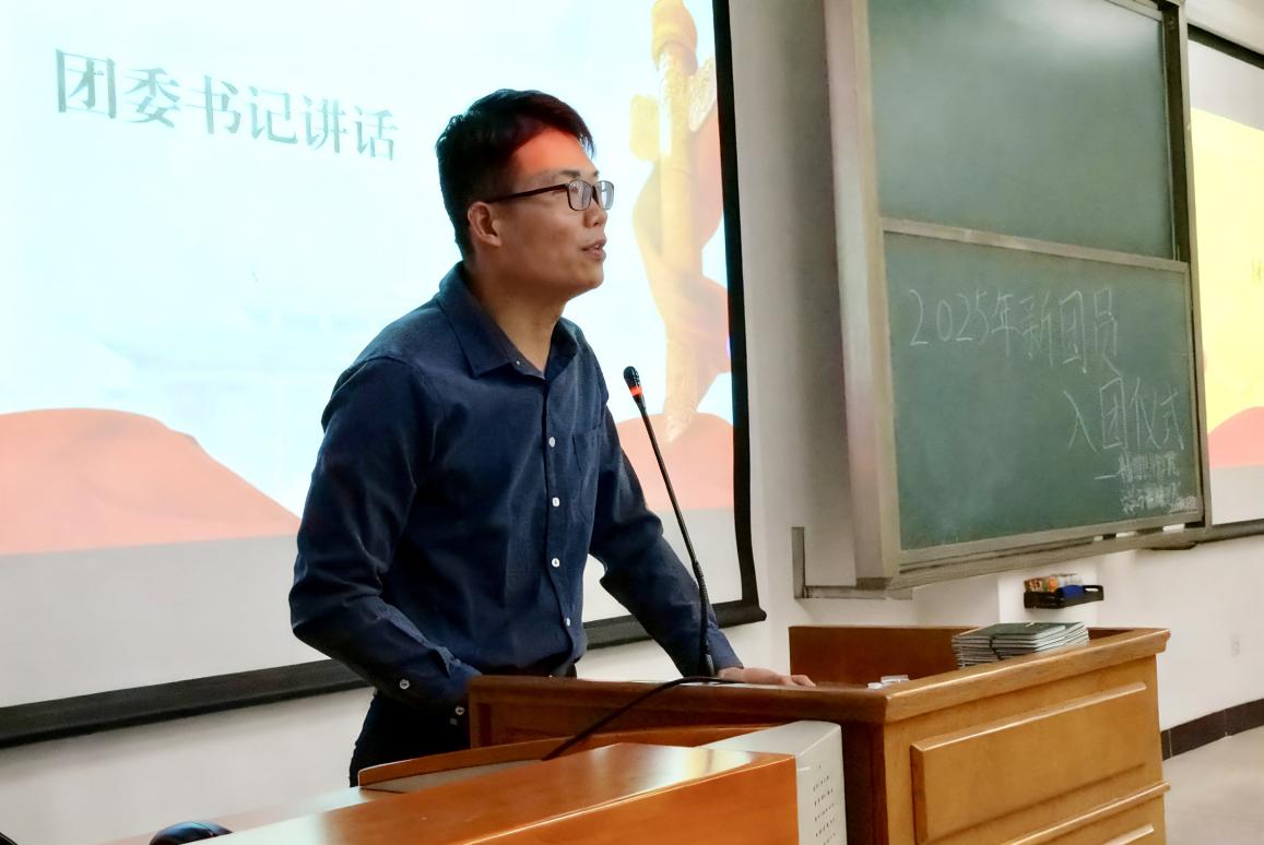 第七项议程,学院团委书记孙嘉创讲话。他向新团员们致以热烈祝贺与欢迎,并指出佩戴团徽、庄严宣誓意味着他们的青春已与共青团使命及国家未来紧密相连。他以共青团的历史征程为基,强调在新时代的道路上,成为一名共青团员,光荣背后更是一份沉甸甸的责任。他特别勉励新团员将责任与专业结合,用文字传递真理、镜头记录时代、声音弘扬正气,做到勤学苦练、知行合一。最后,他向同学们提出三点期望:一是坚定理想信念,将个人融入民族复兴伟业;二是锤炼品德,展现团员风貌;三是勇于担当,在奉献中增长才干,书写属于新时代团员的青春篇章。