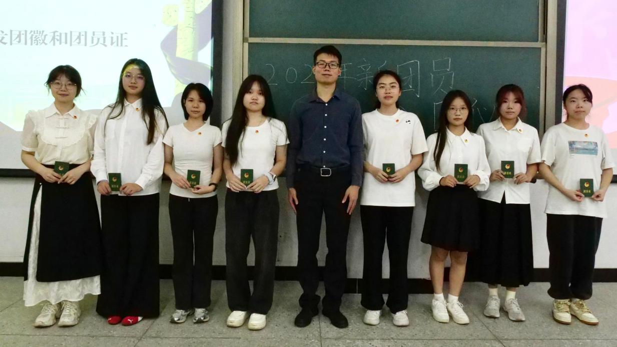 第三项议程,颁发团徽与团员证。在激昂的乐曲中,团委礼仪部成员有序上台,学院团委书记孙嘉创为新团员们颁发并佩戴团徽、递交团员证。这枚小小的团徽,象征着荣誉,更承载着沉甸甸的责任。