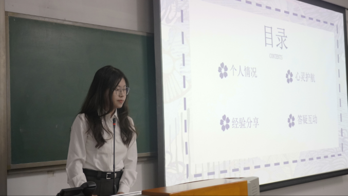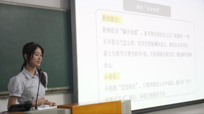 最后,黄慧珊师姐系统分享了大学规划、日常学习安排与期末备考方法。她建议同学们尽早确立明确目标,合理规划各阶段学习任务,善用中国国家数字图书馆、古诗文网等线上资源及校内电子数据库辅助学习。在日常学习中,她提倡制定详细的时间表,注重课堂效率与课后复盘,结合思维导图等方式深化理解;期末备考时则应营造专注的学习环境,合理分配每日复习科目,并善用记忆技巧提升效率。此外,她还鼓励同学们积极参加“挑战杯”、创新创业大赛等实践活动,通过学生工作与社团活动探索兴趣、锻炼能力,实现个人成长的全面提升。