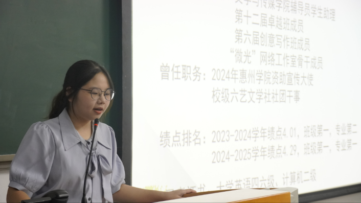 首先,朱秋贤同学围绕日常学习与考试应对策略展开分享。她建议新生从入学伊始便做好各阶段的学业规划,充分利用教材、课堂及网络学习资源,并结合《现代汉语》《文学概论》等具体课程,深入剖析高效学习与科学备考的方法。此外,她鼓励同学们积极参与各类竞赛与实践活动,拓展综合素质。在心态调整方面,她提倡学会独处、享受学习过程,保持冷静理性的态度,勇于尝试、敢于“试错”,在挑战中实现自我成长,同时也要学会适时放松、调节情绪,做到劳逸结合,始终相信自己的潜力与能力。
