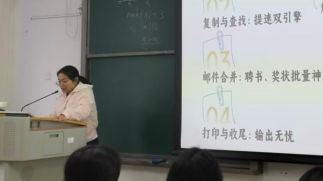钟思施同学向同学们简单介绍了Word应用的基础操作技巧与奖状批量制作注意事项,从基础的新建文档和保存的讲解,到常用快捷键,再到邮件合并功能批量高效制作奖状的方法。同时她还提醒同学们应注意首行缩进2个字符、字体调节等细节问题,以实操演示批量制作奖状结束讲解,鼓励同学们主动学习更多Word应用的内容。