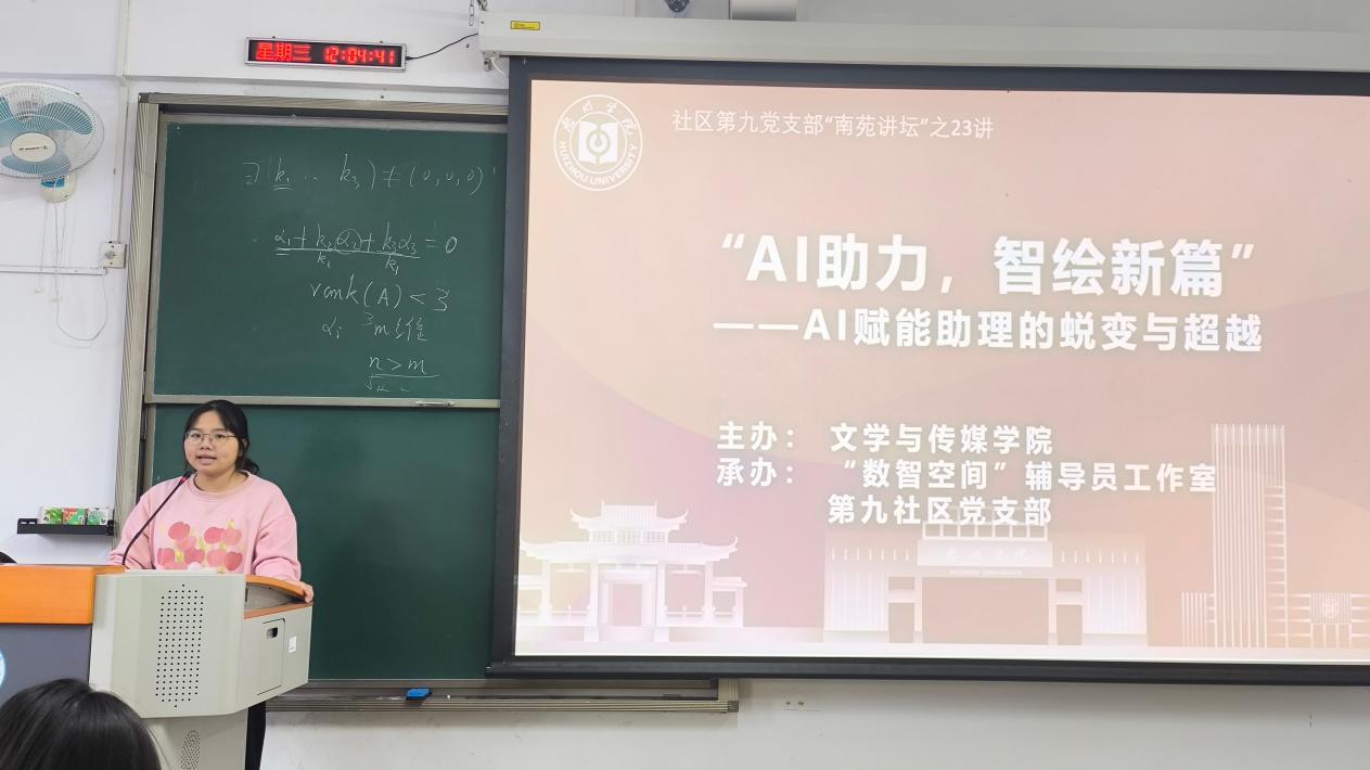 为深化资助育人成效,培养具有数字化办公能力的人才,实现助理团队的转型与突破,新生班干力量的办公技能学习,文学与传媒学院联合“数智空间”辅导员工作室、学生社区第九党支部于11月19日在旭日楼419课室举办“AI助力,智绘新篇”暨新生班干技能培训会。本次培训会由学生助理叶存主持,学生助理、党建服务中心成员和25级班级学生干部在内的79名同学参与。
