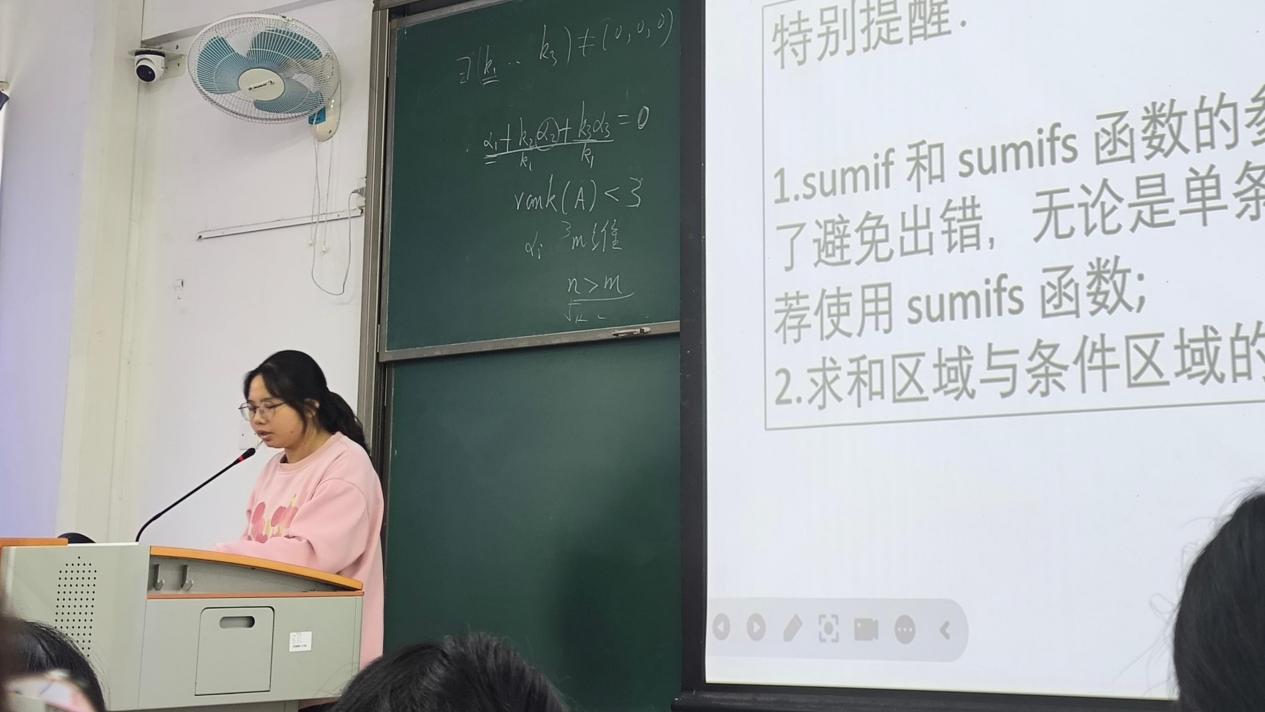 邱梓茵同学给同学们详细介绍了Excel的工作栏和其中对应的功能。她详细地介绍了在办公过程中如何通过排序、筛选等工具让数据处理与分析更加便捷,帮助同学们更好地提高办公效率。叶存同学向同学们介绍了计算机二级的题型、分值以及备考策略,重点讲述了Excel的函数应用,如SUM函数、RANK函数、IF函数等,对未来同学们备考计算机二级提供了思路。