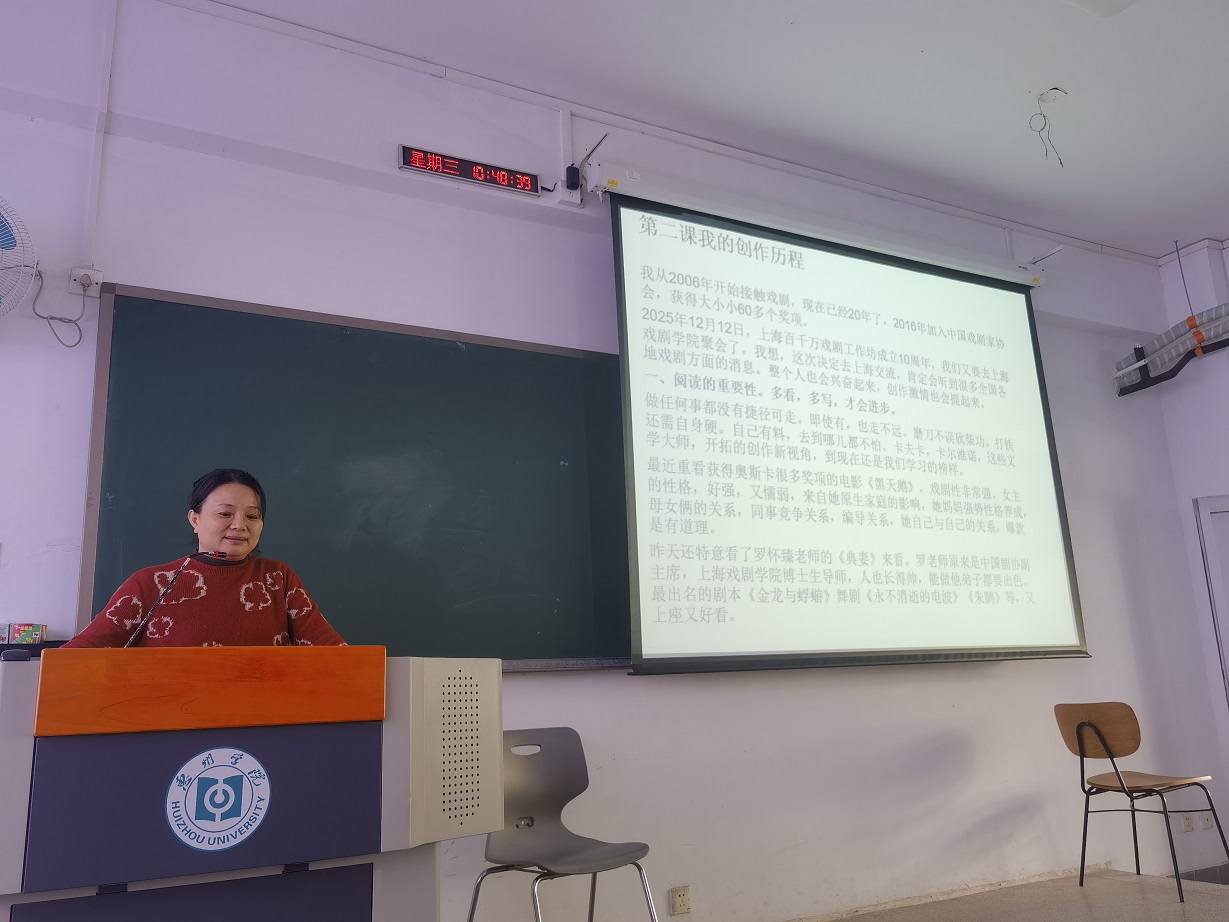 为深化产教融合,拓展学生专业视野,11月5日与11月26日,我院特邀中国戏剧家协会会员、惠阳区作家协会主席、知名编剧李小惠女士,为2024级网络与新媒体专业的同学们带来了两场内容丰富、启迪思维的专题授课。