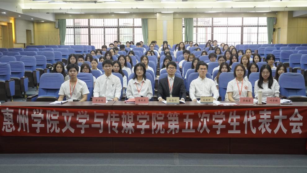 会议主要议程分为三项。在第一项预备会议中,主持人宣读了会议须知,之后由学生代表甄浩明、叶子绿、罗方为依次宣读《文学与传媒学院第五次学生代表大会代表资格审查报告(草案)》《文学与传媒学院第五次学生代表大会议程(草案)》及《惠州学院第五次学生代表大会筹备工作报告》。
