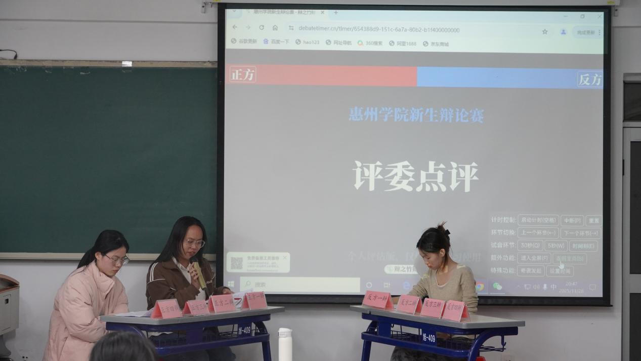 文传辩论队的曾宇彤、黄钰斐、梁家妍三位评委梳理辩论过程,对双方的表现进行细致点评。最终,正方25汉4班“明辨笃行队”更胜一筹,赢得了此场比赛的胜利。