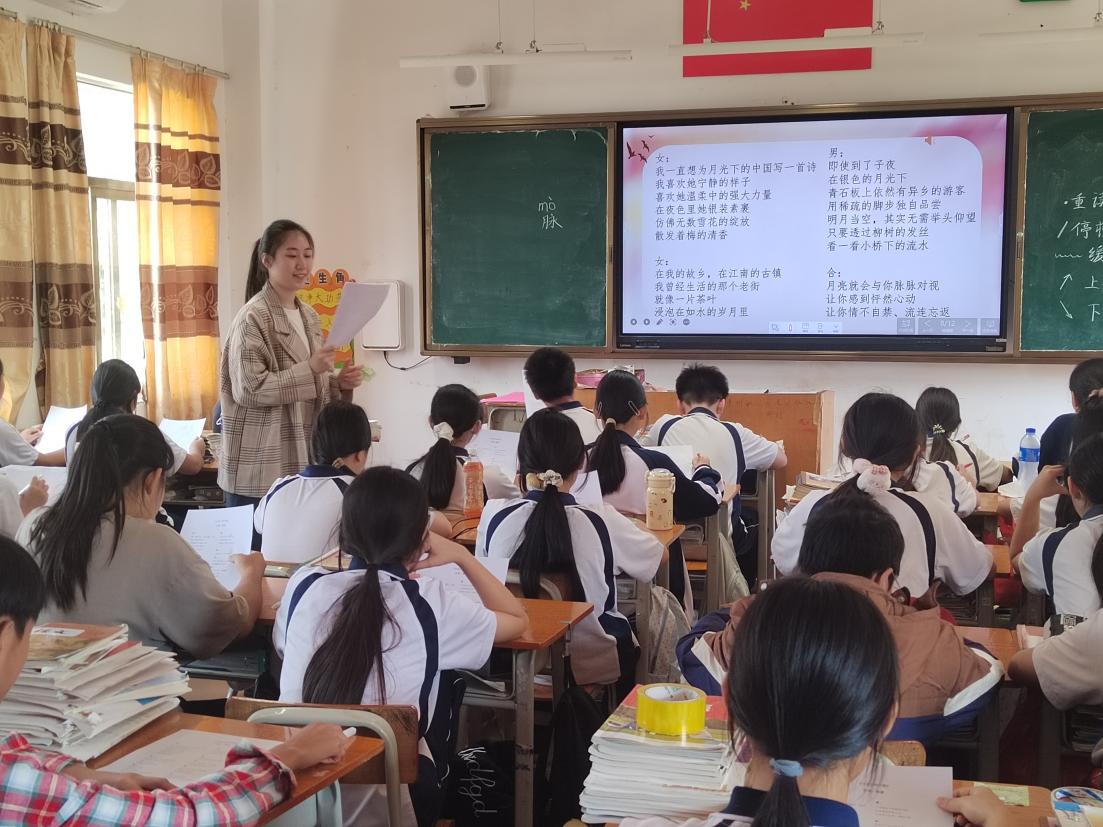 从10月底至11月下旬,团队持续走进龙门县基础教育一线,开展了形式丰富、内容扎实的朗诵美育课程。朗诵教学第一阶段,教师团队以宋代文豪苏轼的《水调歌头·明月几时有》为教学载体,通过逐句诵读、情景模拟、意境体验等方式,引导学生体会古典诗词的韵律美和情感表达。第二阶段,团队则聚焦现代抒情诗《月光下的中国》,在朗诵教学中融入家国情怀的体认与表达,帮助学生在诵读中建立与时代、国家的审美连接。