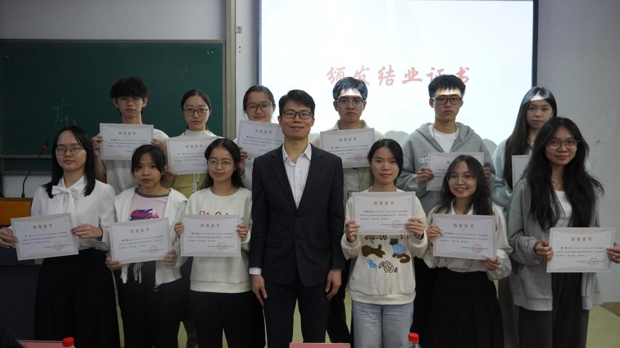 随后,进入证书颁发环节。经过一年的系统培养与综合考核,71名同学顺利完成全部培训任务,杨淑婉等23位同学凭借优异的表现获评“优秀学员”。孙嘉创与施少翰分别为结业学员代表和优秀学员代表颁发证书。台下响起阵阵热烈掌声,既是对学员们成长蜕变的肯定,也是对他们未来征程的期许。