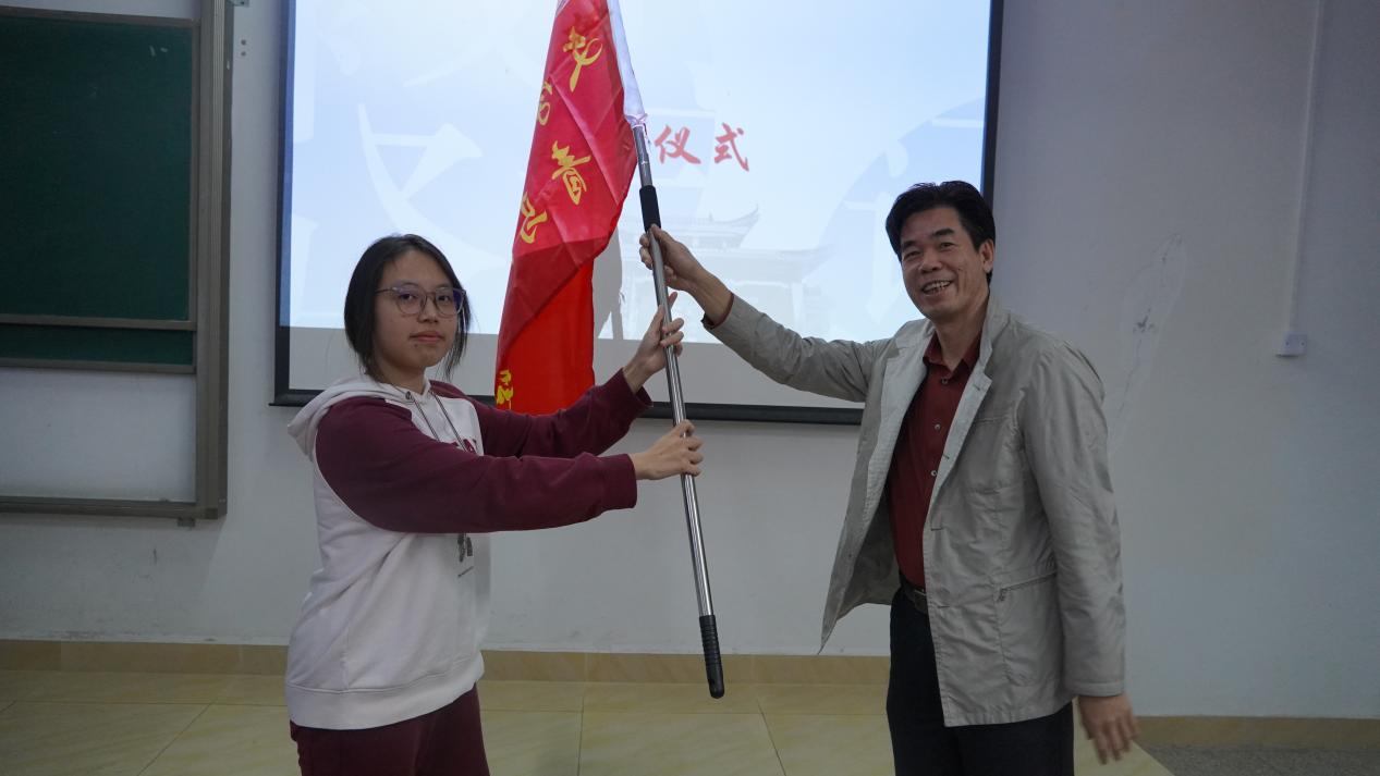 在授旗仪式环节,施少翰亲手将青马班班旗授予第六期青马班班长李铁蓉。旗帜挥舞间,传递的是责任与使命,更是青马精神的接续传承。施少翰在讲话中对新学员表示欢迎,他强调,青马工程是培育青年理想信念、家国情怀与担当精神的关键平台,对培养复合型人才意义重大。他希望新学员筑牢信仰之基、坚持知行合一、自觉学以示范,以专业所长服务同学与社会;学院也将提供优质资源保障,助力学员成长。