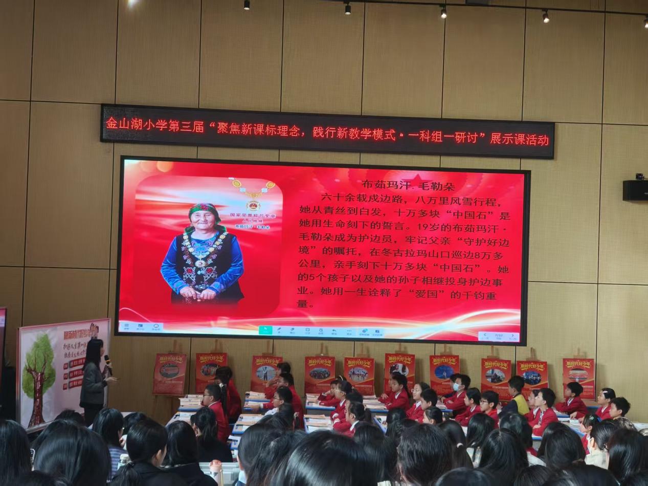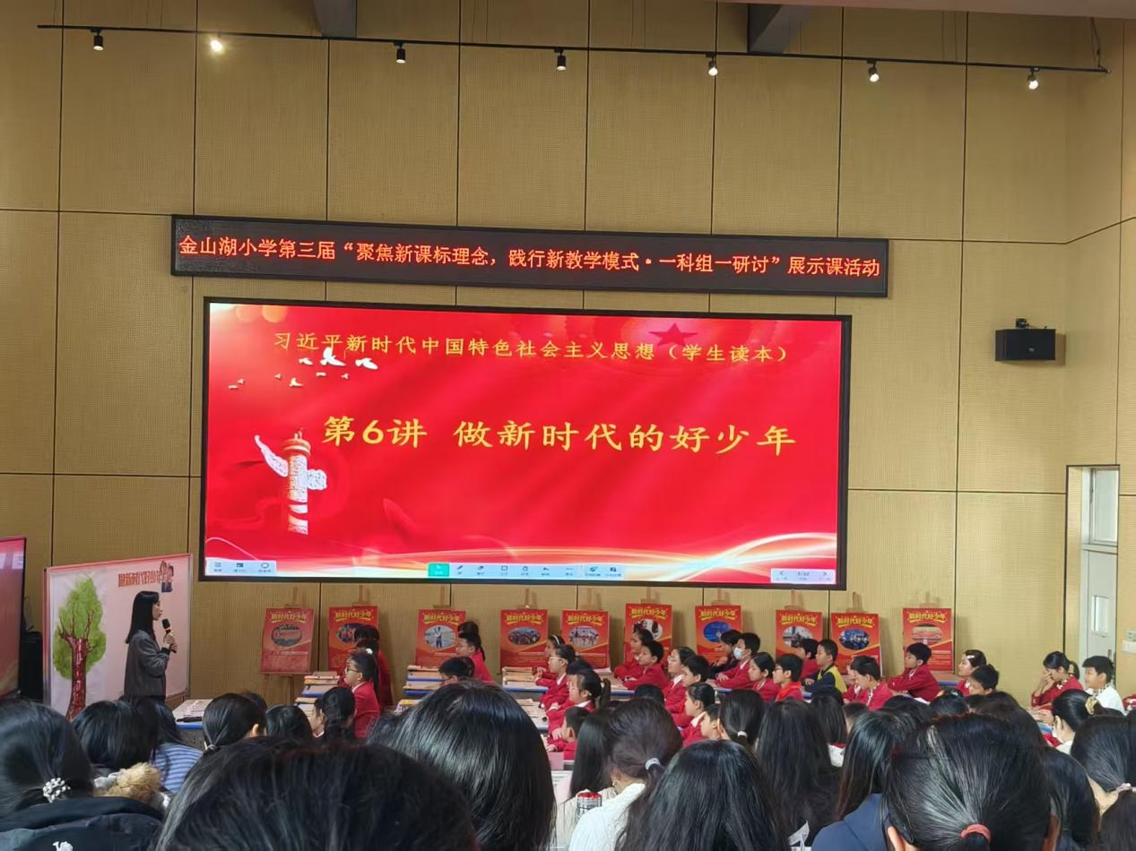 在金山湖小学阶梯教室,该校陈小芳老师以《习近平新时代中国特色社会主义思想学生读本》第六讲“做新时代的好少年”为主题,呈现了一堂创新融合的示范课。课堂伊始,陈老师通过情景互动视频引出“扣好人生第一颗扣子”的核心议题,随后结合社会主义核心价值观,以护边员毛勒朵、“当代愚公”黄大发的感人事迹为依托,层层递进引导学生感悟榜样精神。