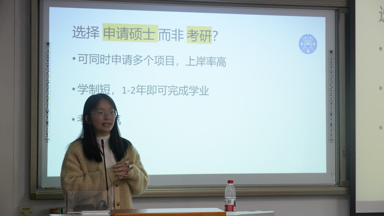 会议伊始,王诗涵先对比了“申请硕士”与“考研”的差异,指出申请硕士可同时申报多个项目、学制较短等优势,并说明港澳地区院校排名高、认可度强,对汉语言文学专业申请较为友好。随后王诗涵重点强调了学校专业选择以及如何上梦校这两方面。对于学校及专业选择,她将其分为三部分,包括参考依据、具体专业的选择与信息来源的渠道。参考依据包括硬背景(绩点、语言成绩和本科院校)和软实力(实习、科研、论文/作品、获奖/荣誉、技能证书)两部分,她以自身为例,特别指出硬背景与软背景之间的差异。她还建议同学们要根据自身喜好选择适合的专业,并通过多种渠道了解信息。