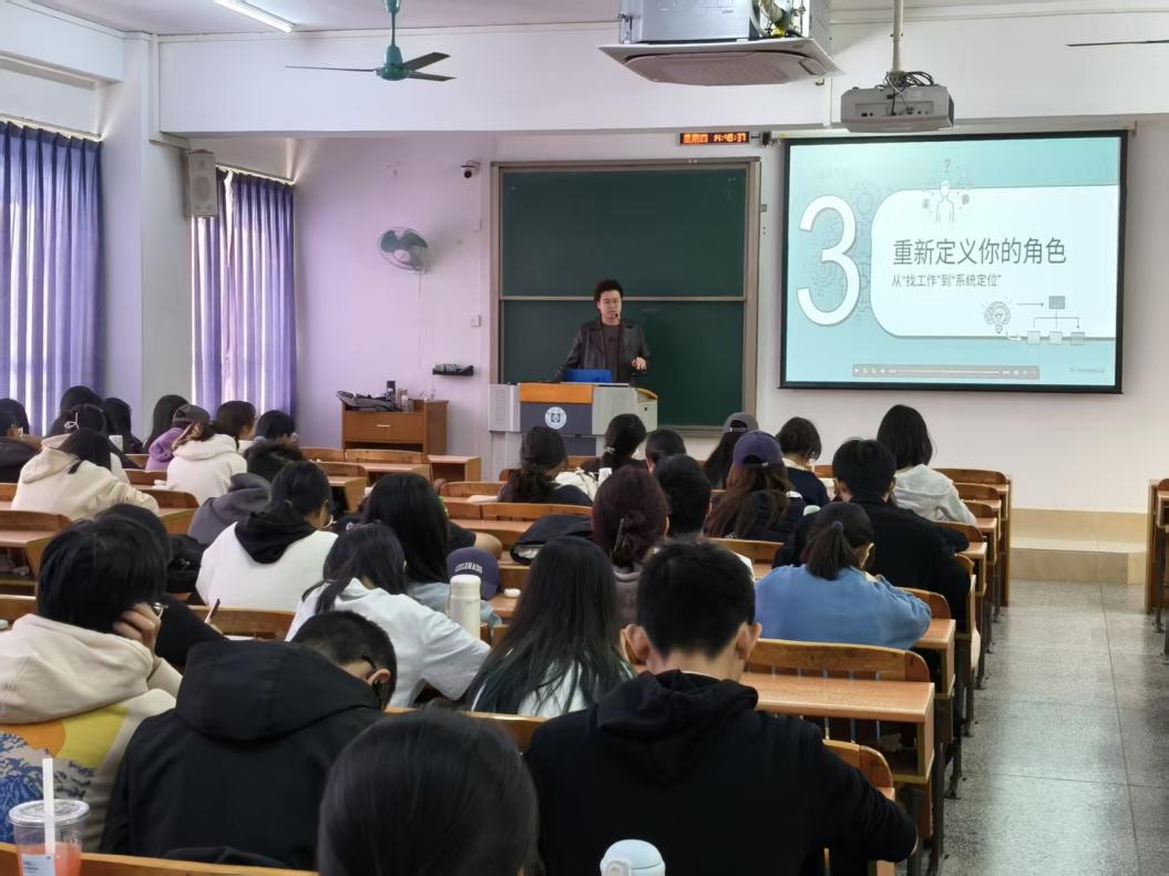 陈海建健从冯・诺依曼的系统思维的视角出发,指出AI+平台构成了多方博弈的复杂系统,创业者与求职者需具备全局视野,跳出“岗位思维”转向“产业链思维”。他分享“三分归元”方法论与AI高效使用四大策略,结合心理学分析历史创业案例,用“生产力决定生产关系”解读AI时代的创业机遇,强调知识迁移与系统理解力的重要性。针对网络与新媒体专业特性,他以自身探索AI真人形象赛道的创业经历,详解无需实拍、AI生成素材拼接的创新创作模式,直观呈现其节省成本、快速试错的创业优势,并通过论文写作、短视频创作等场景拆解“三生万物”工作流程,现场借助AI脚本与剪映功能完成高质量作品,展现AI对创业效率的赋能价值。最后,他还寄语同学们在大学期间,应当夯实逻辑思维、语言写作等基础能力的同时,锤炼快速学习新工具的能力,明确自身价值定位与社会责任。