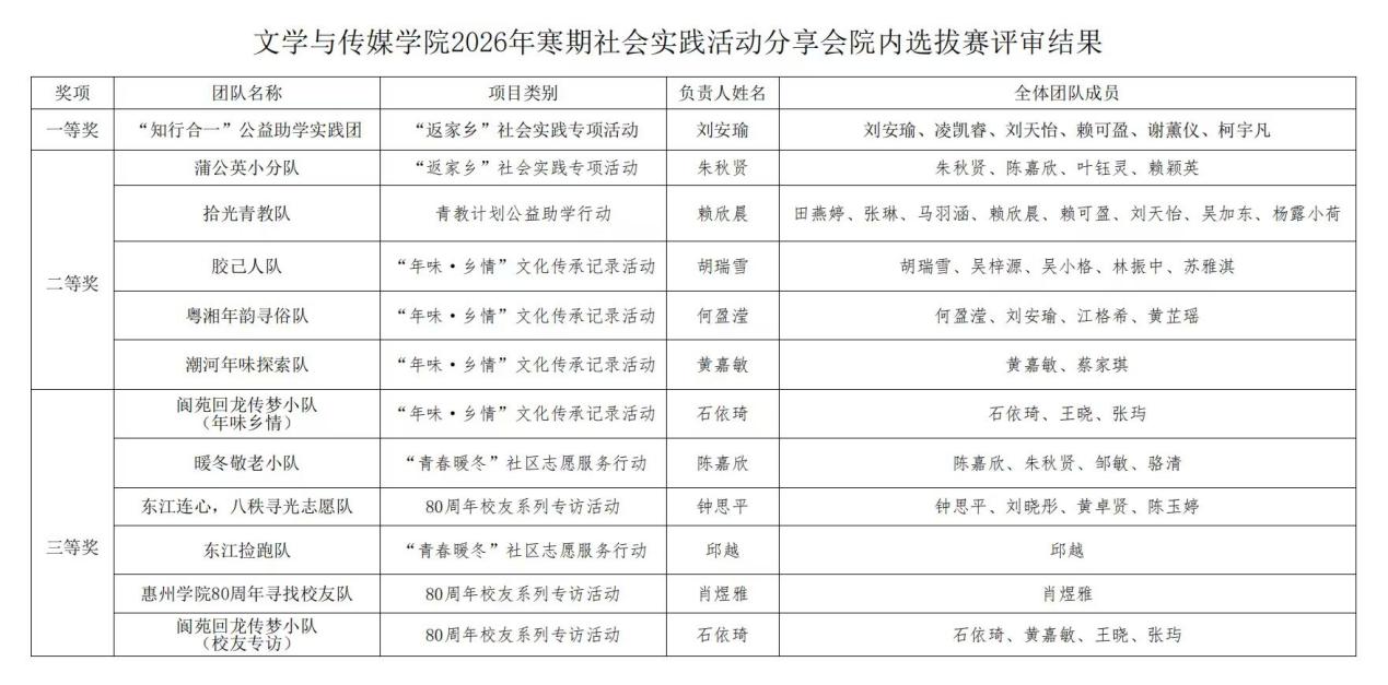 八十载弦歌不辍,新时代步履铿锵。值惠州学院八十周年华诞之际,文学与传媒学院以校庆为主线,统筹开展涵盖校友走访、年味寻访、支教助学、志愿服务等主题内容,作为2026年的寒假社会实践活动。11支实践队伍各展所长、躬身实践,以文传专业底蕴赋能实践,用青春担当为校庆添彩,让青春之花在基层一线与文化传承之路上绚丽绽放。