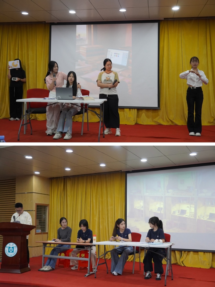 比赛伊始,主持人介绍活动流程、评审标准及赛事意义,两支参赛队伍轮番登台,以大学生真实生活为蓝本展开演绎:《死线战争——夺命48小时》通过“快乐人格”与“焦虑人格”的内心博弈,展现学子应对学业压力、实现自我和解的过程;《无声的在意》则还原宿舍备考场景,以矛盾化解传递宿舍相处中理解包容的重要性,鲜活剧情直击心理痛点,引发全场共鸣。